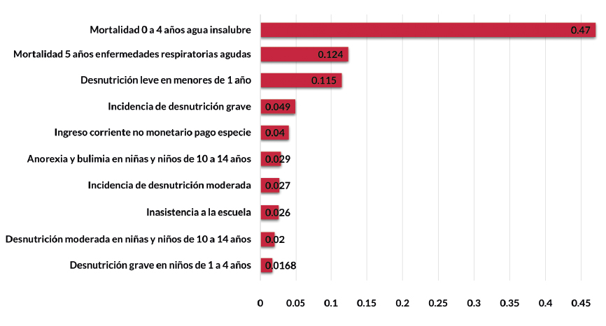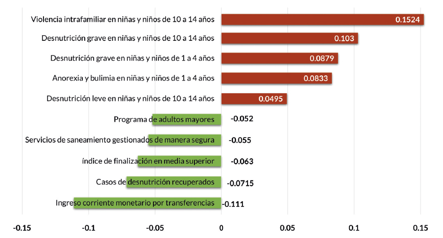 Las tablas y los mapas siguientes fueron elaborados con las predicciones de riesgo del algoritmo XGBoost. La ganancia se refiere a la medida relativa en que contribuye cada factor a mover las ratios o razones de estudio, independientemente de su dirección o de sus efectos de interacción con otros factores; en pocas palabras, es el efecto bruto de cada factor. El ratio o la razón se refiere a una relación entre dos medidas. Cuando se dice “factores que afectan la ratio de Talla para la edad” se refiere a los que tienen mayor influencia (ya sea positiva o negativa) en si un niño o niña tiene la Talla adecuada para su edad. Para facilitar la lectura, se resaltaron en color verde aquellos factores que sirven de protección, mientras que en rojo se encuentran los que contribuyen a la baja talla. Los factores que se presentan como protectores o contribuidores de la desnutrición crónica son factores nacionales. No se deben interpretar a nivel estatal.